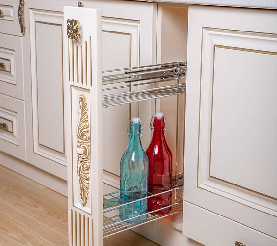 Фурнитура: Бутылочница с доводчиками. Возможность встраивания холодильного оборудования (Модуль М1). Модуль для посудо-сушителя оборудован механизмом для смежных дверей плавного открывания фирмы Hettich (Германия)