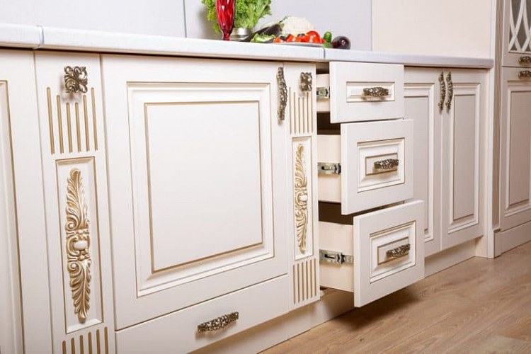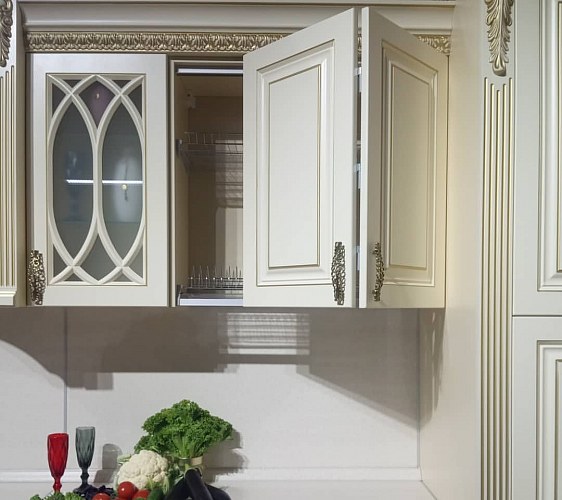 Материал фасада: МДФ/Лак/Патина. Цвет светло-бежевый, патина золото Renner. Водостойкий лак Sayerlack (Италия). Фасады толщиной 19мм.