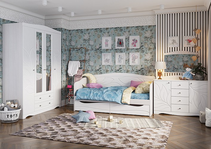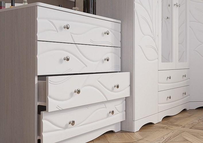 Модульная система BLOOM - мягкая, светлая, изящная. Создает комфортную атмосферу в спальне для отдыха и релакса. Белый цвет, приятные на ощупь фасады софт тач. Плавные линии и широкий рисунок на фасадах, в сочетании с белым цветом и бархатистой поверхностью, создают эффект нежности, воздушности и гибкости. Визуально увеличивает пространство.