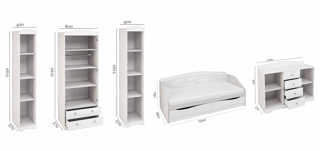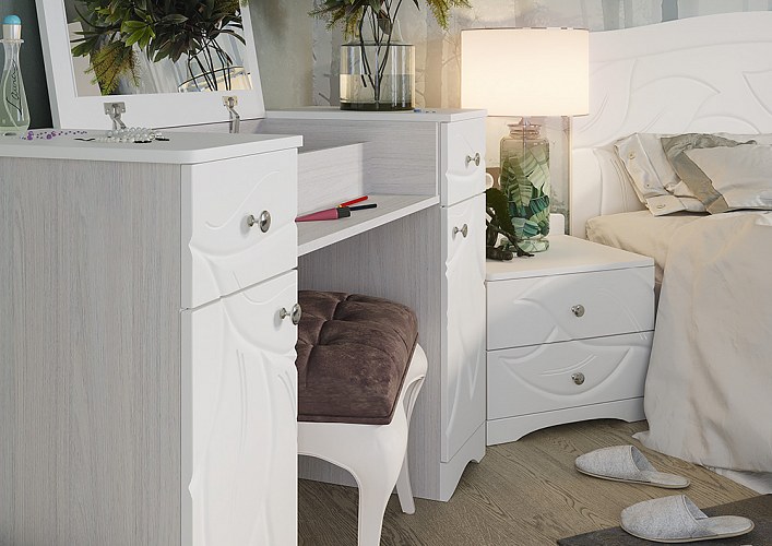 Длительное комфортное использование обеспечено качественными материалами и фурнитурой. Ящики на шариковых направляющих полного выдвижения. Косметический стол имеет подъемное зеркало.