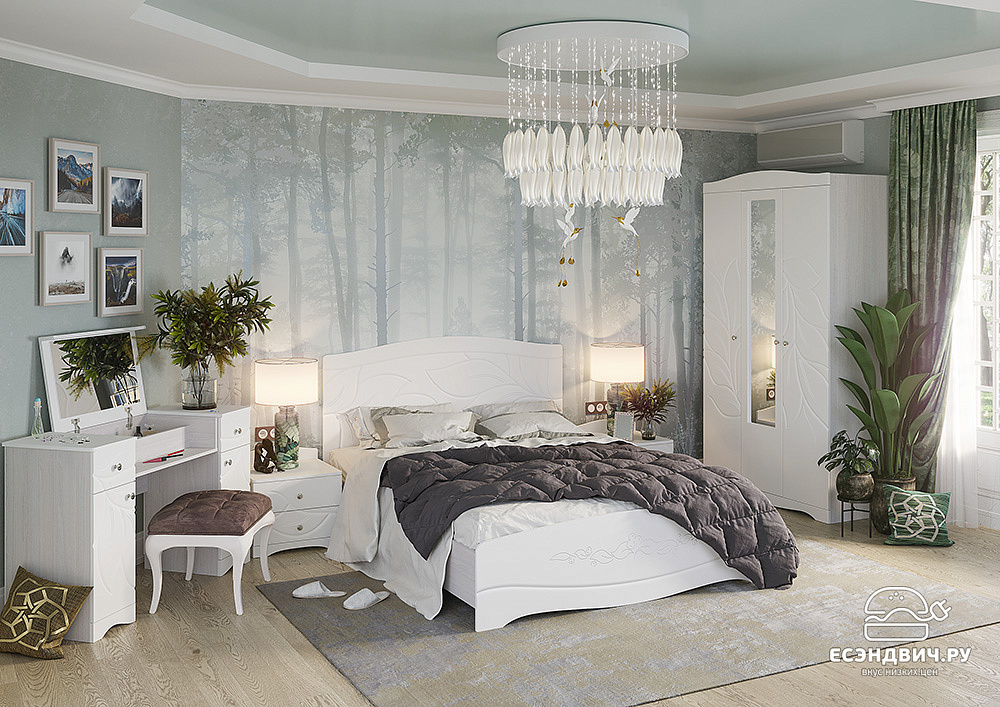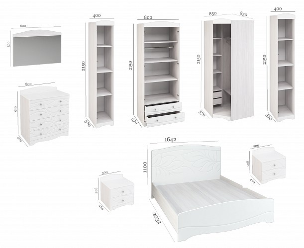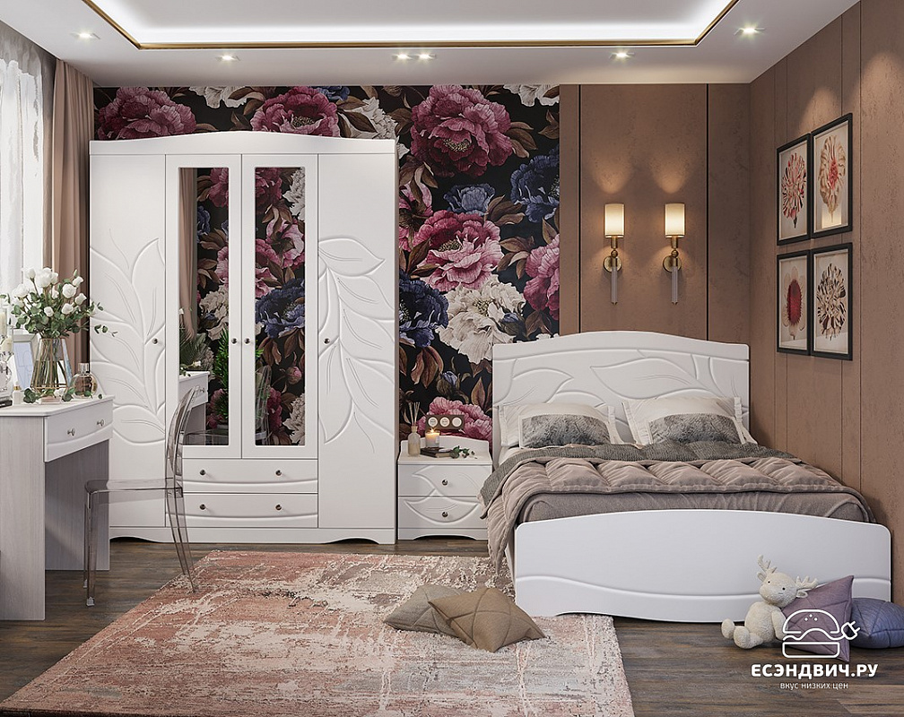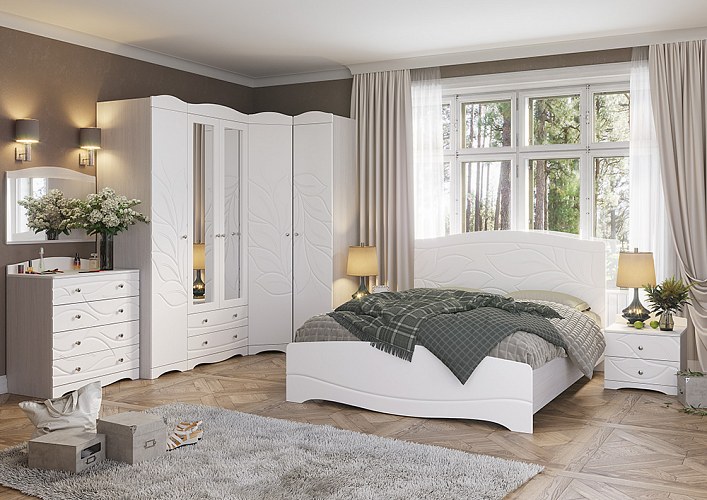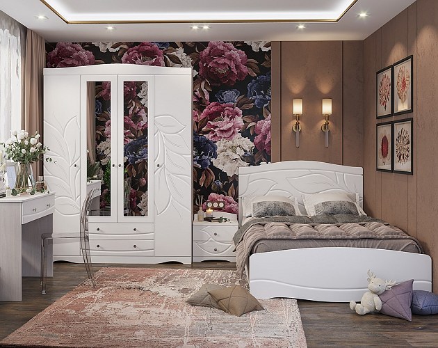Модульная система BLOOM - мягкая, светлая, изящная. Создает комфортную атмосферу в спальне для отдыха и релакса. Белый цвет, приятные на ощупь фасады софт тач. Плавные линии и широкий рисунок на фасадах, в сочетании с белым цветом и бархатистой поверхностью, создают эффект нежности, воздушности и гибкости. Визуально увеличивает пространство.