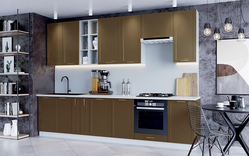 Модули с фасадами глубоких насыщенных оттенков Античное золото, Шоколад, Черника легко вольется в модерновую симфонию чистых линий, лаконичных форм и ярких цветовых акцентов.