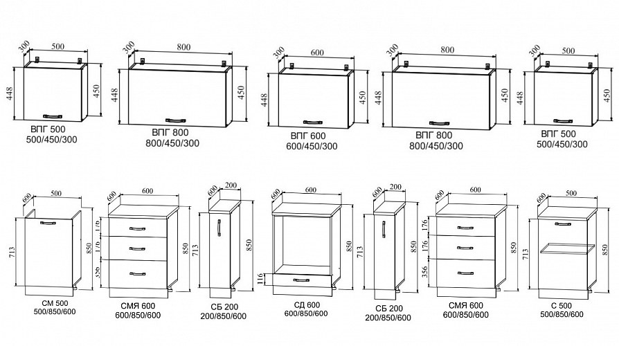 Пеналы шириной 40 и 60 см. В каждой расцветке 6 видов пеналов. Полностью закрытые или с нишей для духового шкафа.