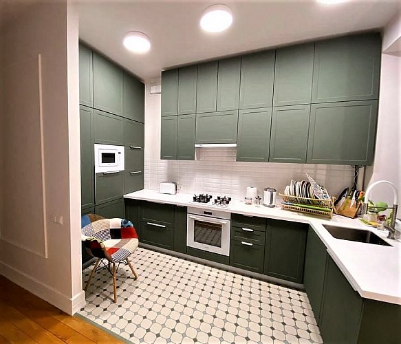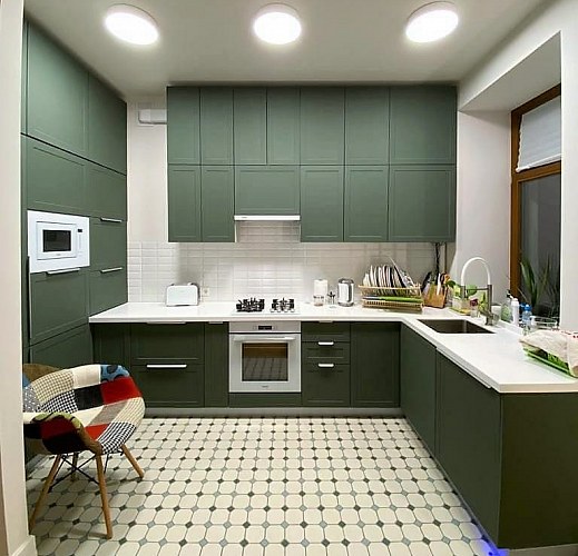 Высокие (90см) шкафы придают современный дизайн кухне и увеличивают полезную площадь хранения.
