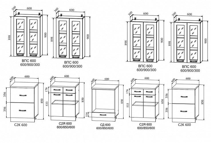 Пеналы шириной 40 и 60 см. В каждой расцветке 6 видов пеналов. Полностью закрытые или с нишей для духового шкафа.