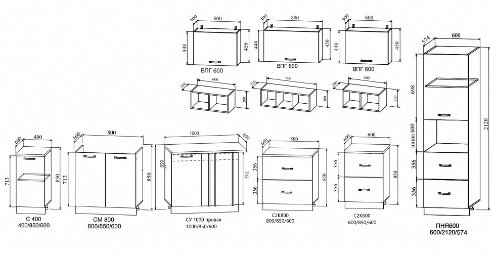 Пеналы шириной 40 и 60 см. В каждой расцветке 6 видов пеналов. Полностью закрытые или с нишей для духового шкафа.