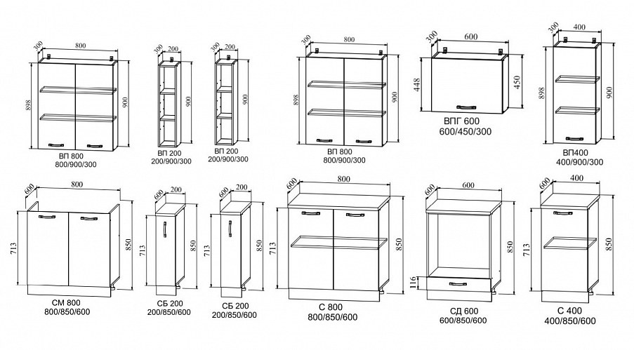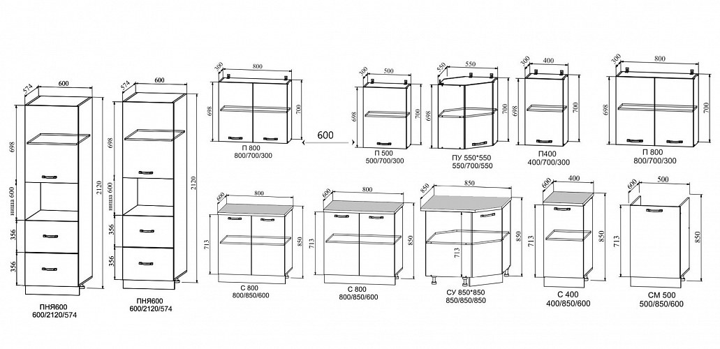 Пеналы шириной 40 и 60 см. В каждой расцветке 6 видов пеналов. Полностью закрытые или с нишей для духового шкафа.