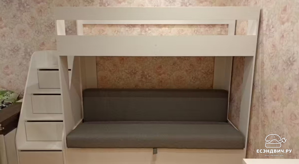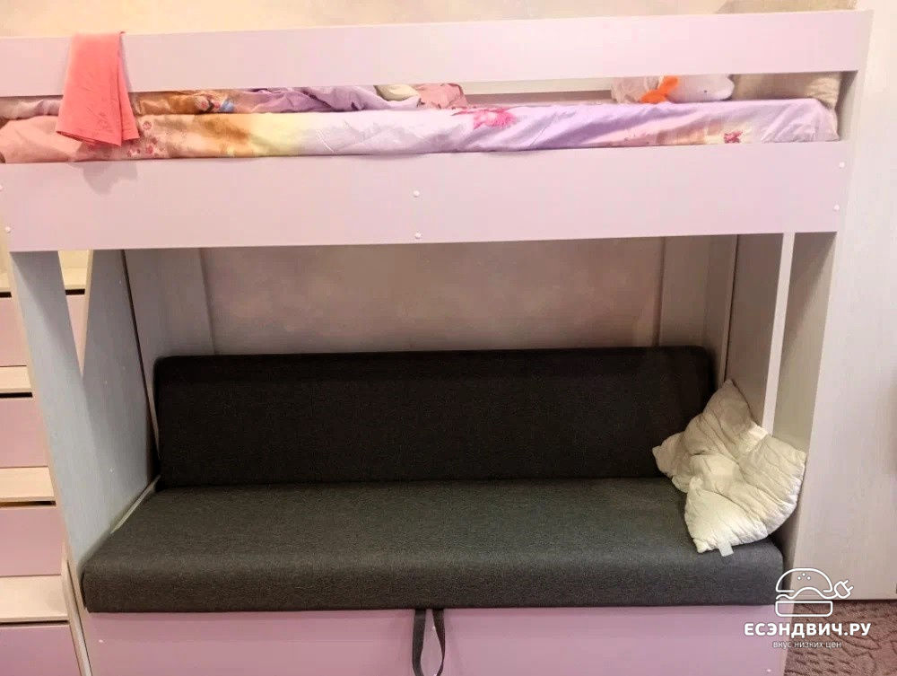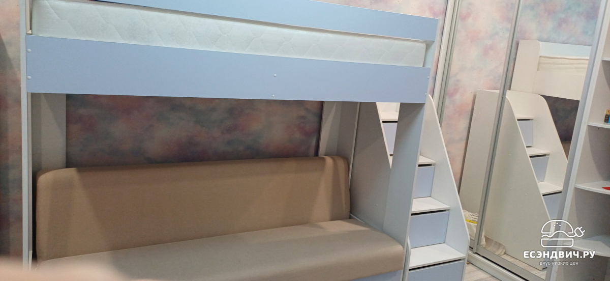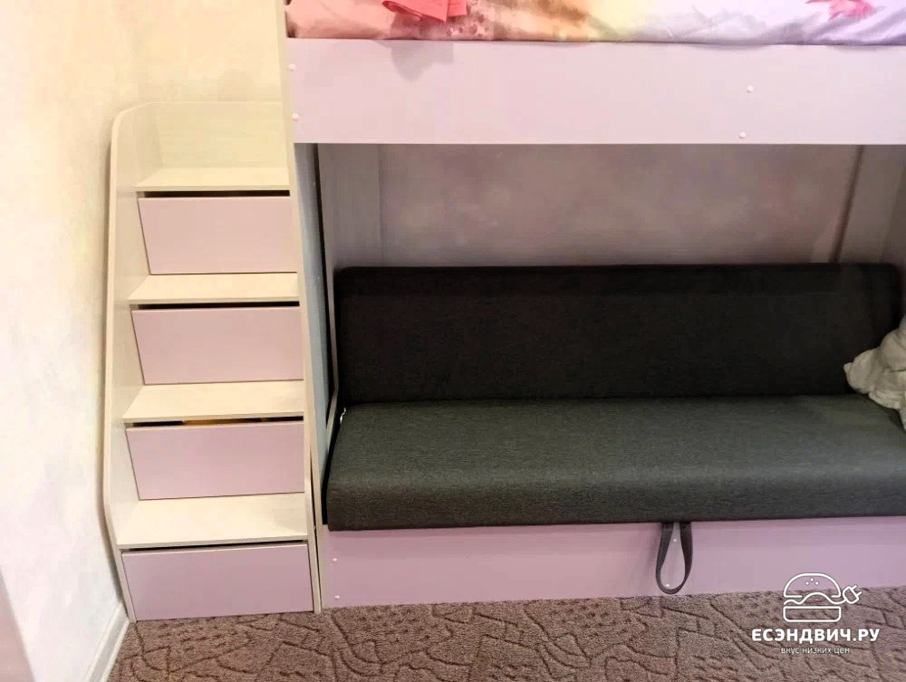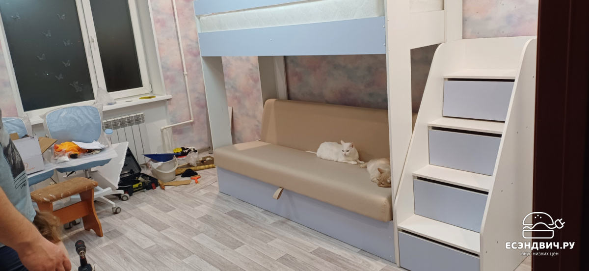 Отличная кровать. Пришла вся целая, без каких либо дефектов. Упакована хорошо, в обрешётке. Подробная инструкция с картинками, легкая сборка. Лестницу комод можете ставить с любой стороны. Диван легко раскладывается, есть место для хранения. Ткань хорошая, зацепок не оставляет, пятна легко удалить влажной салфеткой.