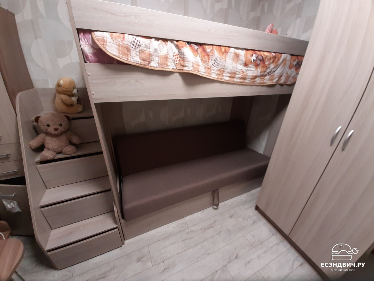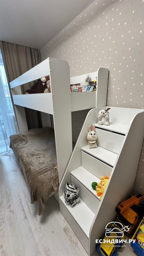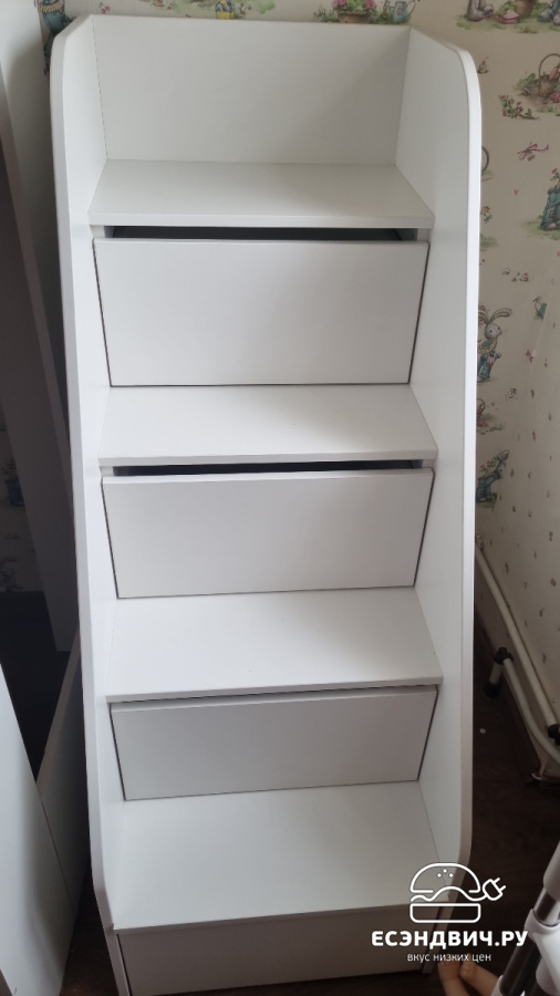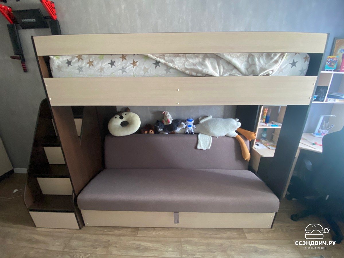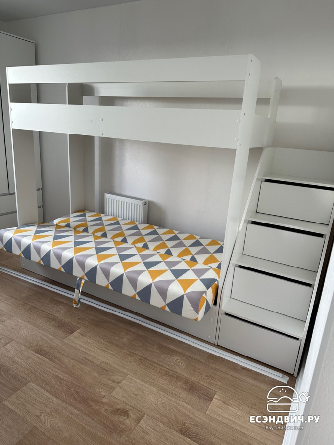 Отличная кровать. Пришла вся целая, без каких либо дефектов. Упакована хорошо, в обрешётке. Подробная инструкция с картинками, легкая сборка. Лестницу комод можете ставить с любой стороны. Диван легко раскладывается, есть место для хранения. Ткань хорошая, зацепок не оставляет, пятна легко удалить влажной салфеткой.