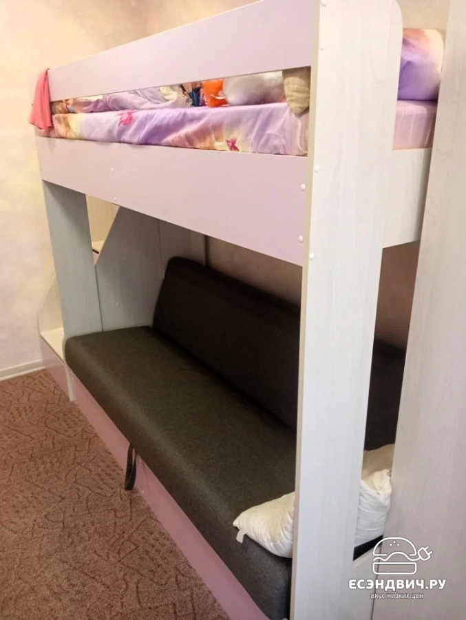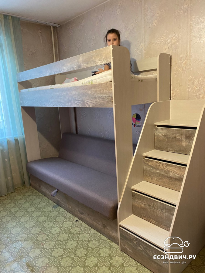 | Кровать двухъярусная с диваном и лестницей с ящиками -- это современное и функциональное решение для всех возрастов. Отлично экономит площадь в комнате. Экономит деньги на покупку мебели, поскольку сочетает в себе и диван, и раздельные спальные места, и одновременно вместительный комод. Подойдёт для детской, подростковой комнаты, и вполне приемлема для взрослых. Спальное место верхнего яруса 190x80 см. Матрас приобретается отдельно, подойдёт любой толщины. Размеры матраса нужны под размер спального места – 190х80 см. Спальное место нижнего яруса – это раскладывающийся диван-книжка. В разложенном состоянии получается спальное место, размером 110x190см. В сложенном – комфортный диван для сидения двух или трёх человек. Диван выполнен без пружин, мягкий, из пенополиуретана толщиной 50мм. Место под диваном можно использовать для хранения вещей, однако оно не оборудовано днищем. Верхний ярус имеет бортик безопасности. Лестница-комод с плавными и бесшумными шариковыми направляющими. При выдвижении, ящики фиксируются (не падают). Лестницу-комод при сборке можно расположить справа или слева от кровати. Это позволяет максимально удобно расположить кровать в комнате. Кромки фасадов обработаны лентой ПВХ толщиной 2 мм, что обеспечивает долговечность и безопасность конструкции. Благодаря этому, нет острого края и сколов, а мягкие кромки выглядят стильно и аккуратно. Кровать имеет устойчивую, надежную конструкцию из ЛДСП. Однако для большей безопасности можем рекомендовать дополнительно крепить кровать к стене, это увеличит возможность нагрузки на верхнее спальное место. Изделие поставляется в заводской упаковке, включающее четыре коробки из гофрокартона и полиэтилена и инструкцию по сборке. Характеристики, позволяющие лучше понять комфортность использования: Высота борта от жесткого основания второго яруса 32 см. Высота от поверхности верхней ступени лестницы до верхнего края верхней боковой планки 40 см. Высота от пола до верхней плоскости диванной подушки 43 см. Высота проема для сидящего человека - 85 см. Допустимая нагрузка на верхнее спальное место 80 кг, на нижнее спальное место - 200 кг. Закругленные углы боковых стоек предусмотрены для безопасности детей. Лестница жестко крепится к кровати. Лестницу можно разместить как справа, так и слева, для этого разметка под крепления лестницы отсутствует. Полезная глубина ступеней лестницы-комода (полок) сверху - вниз: 18,2 см ; 18,4 см ; 20 см; 28,6 см. | |