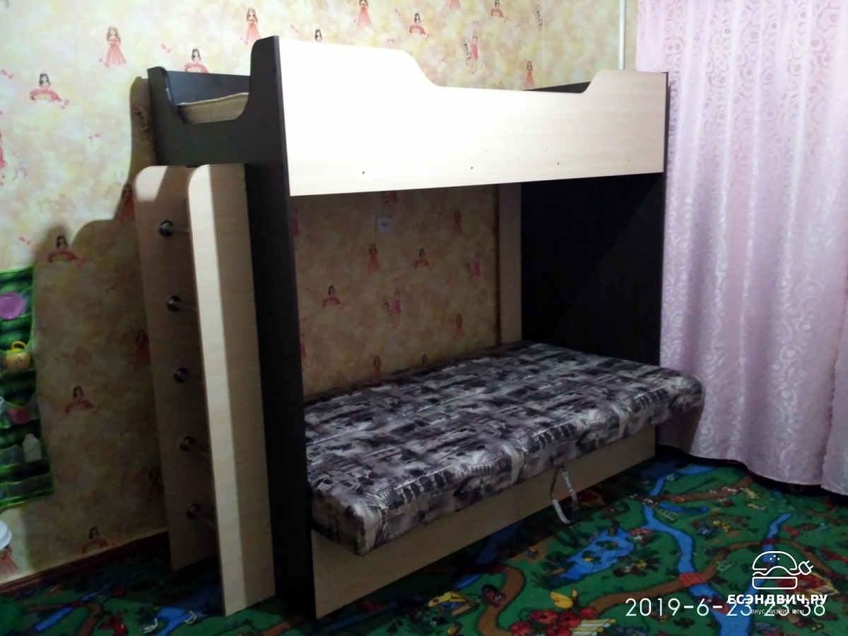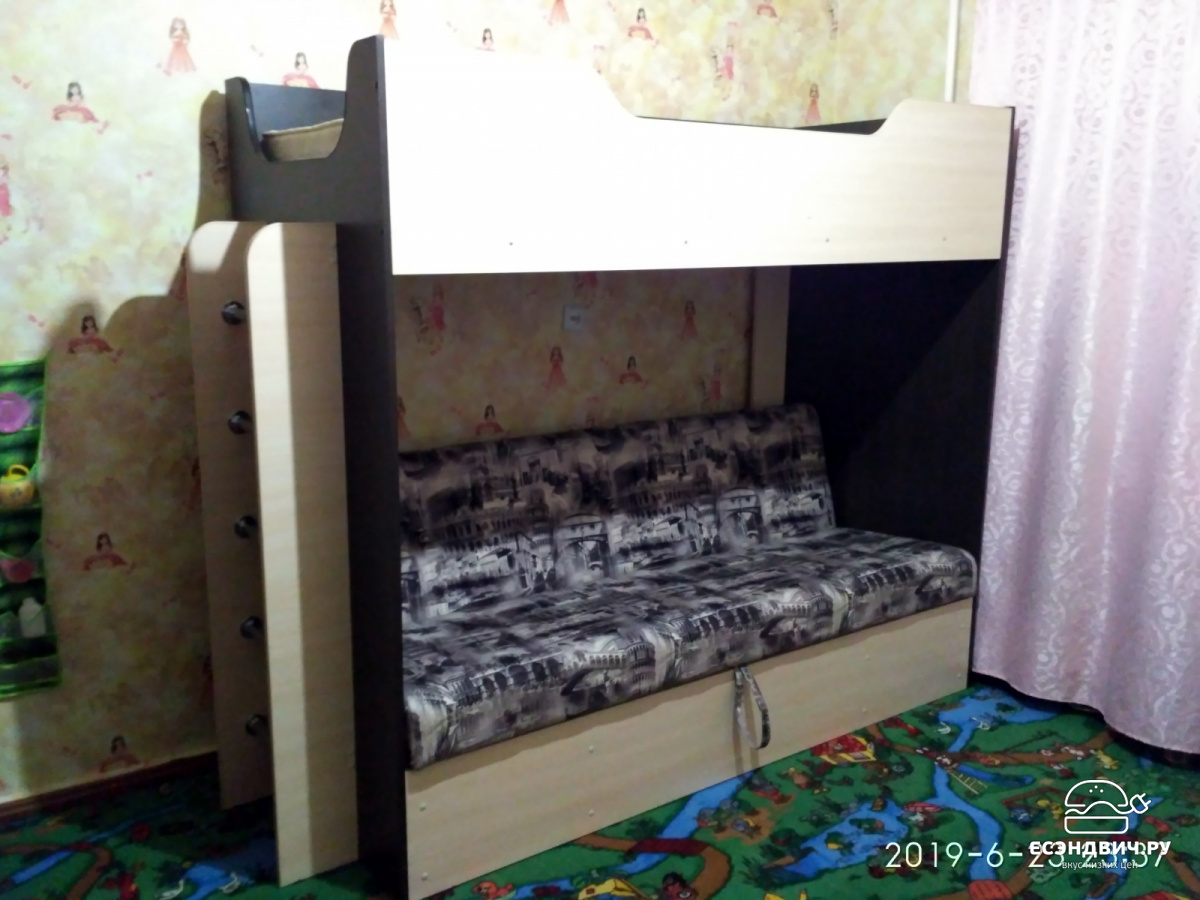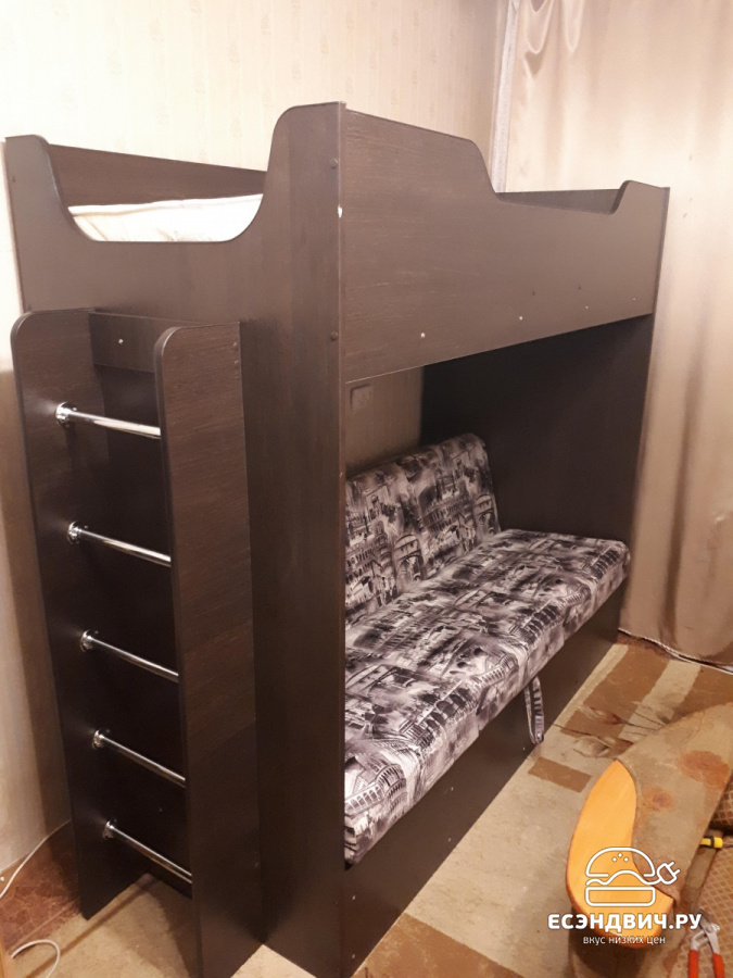 | Преимущества | Двухъярусная кровать с диваном - эргономичный современный вариант организации пространства. Заменяет собой сразу несколько предметов интерьера при достаточной компактности и удобстве размещения. Конструкция позволяет устанавливать лестницу с любой стороны. Ступеньки лестницы выполнены из хромированной трубы. Раскладывающийся диван - книжка с наполнителем ППУ можно использовать как комфортное спальное место размером 1100х1900 мм. Обивка дивана выполнена из износоустойчивой мебельной ткани, простой в уходе. Верхний ярус конструкции имеет стандартное спальное место, размером 800х1900. |