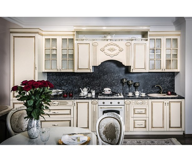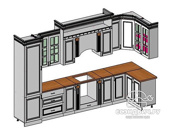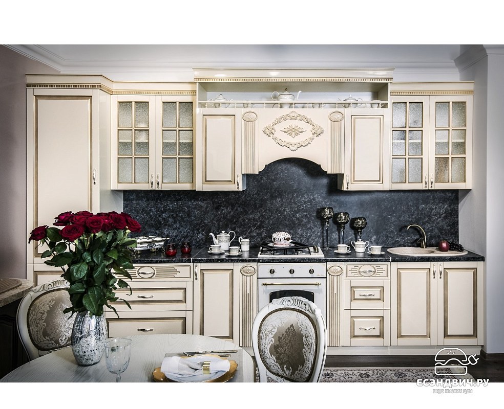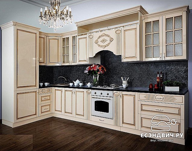 Кухня угловая 3,9х1,6 (универс.угол) "Маэстро" (МДФ) (Крем глянец/Патина/Лак) UgVr