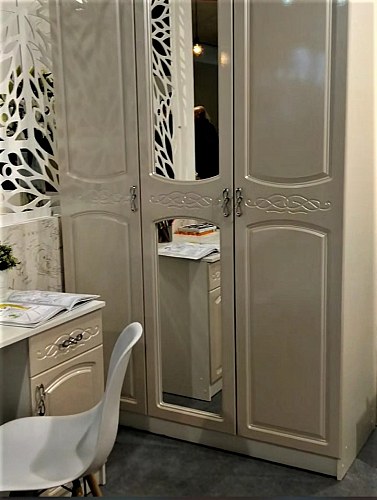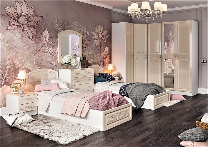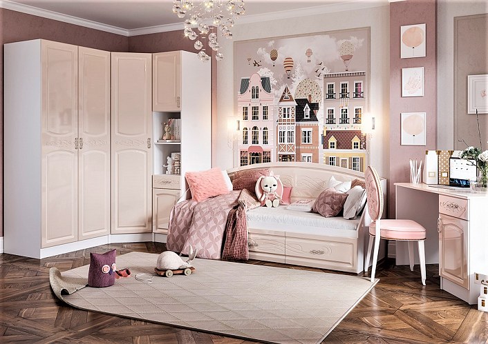 Париж - модульная подростковая коллекция. Высота шкафов 210 см. Фасады выполнены из МДФ цвет Жемчуг перламутр украшены изящной фрезеровкой.