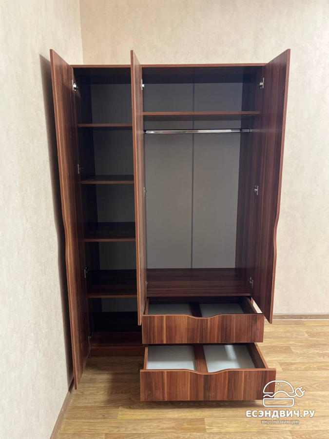 | Отличительные черты | Вместительный и функциональный трёхдверный шкаф из коллекции Лаворо. Имеет отделение со штангой, отделение с полками и два выдвижных ящика. Дверцы и ящики открываются за край фасадов. Бесшумные полновыкатные шариковые направляющие ящиков. Торцевые стороны деталей фасадов обработаны кромкой ПВХ толщиной 2 мм. Боковые стойки имеют скос под плинтус, высота фасадов ящиков 200 мм , ширина двери отделения с полками 413 мм, высота цоколя 70 мм, полновыкатные ящики обеспечивают легкий доступ к вещам. |